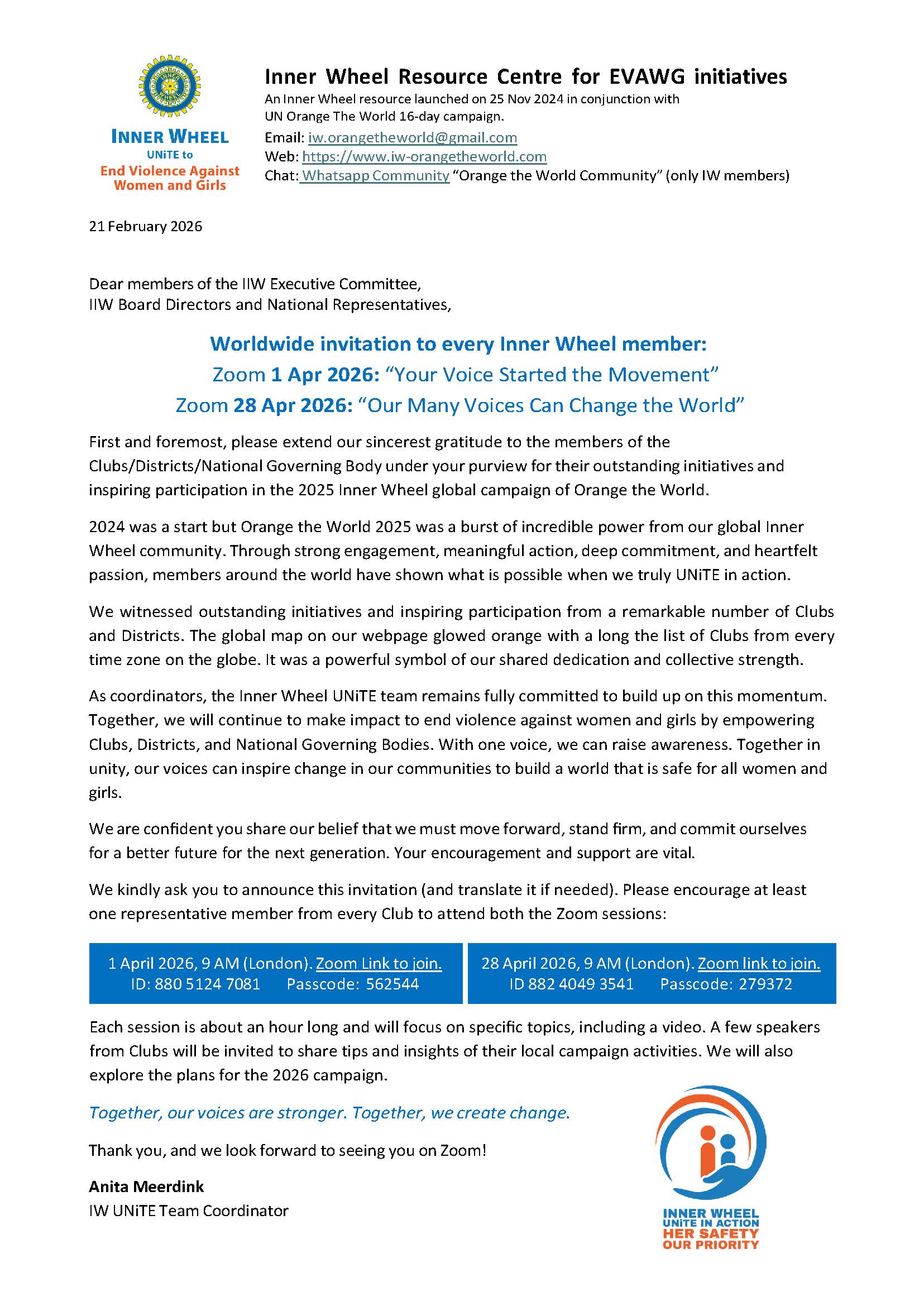 Am Mittwoch, den 01. April 2026 findet ein weltweites Zoom-Meeting um 10.00Uhr morgens statt zum Thema: „Your voice started a movement. Reach beyond Inner Wheel including men.“