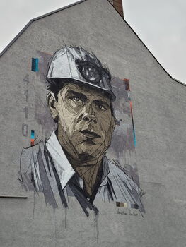 Ein Bergmann an einer Hauswand in Lünen-Süd erinnert an die untergegangenen Zechen am Ende des vorigen Jahrhunderts.